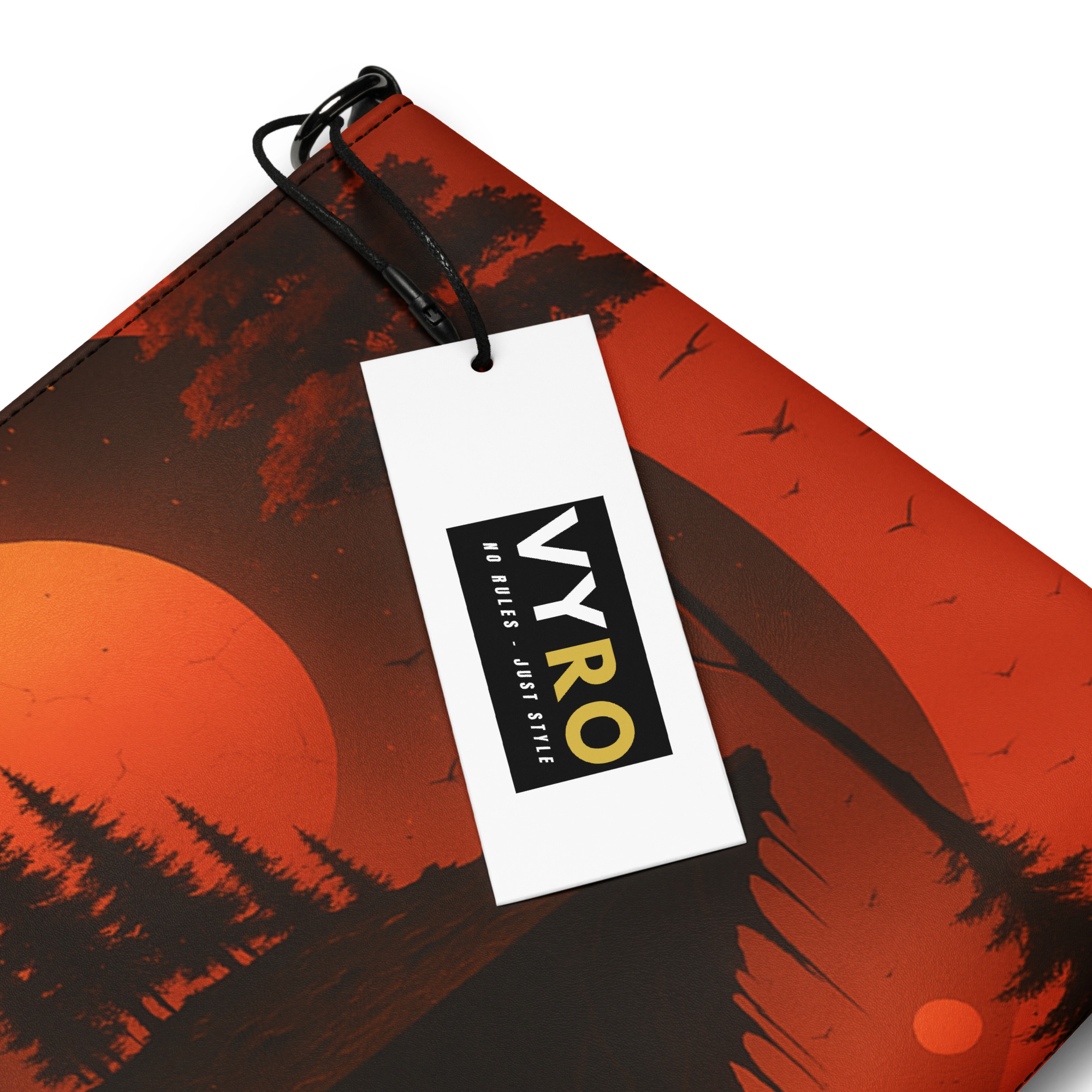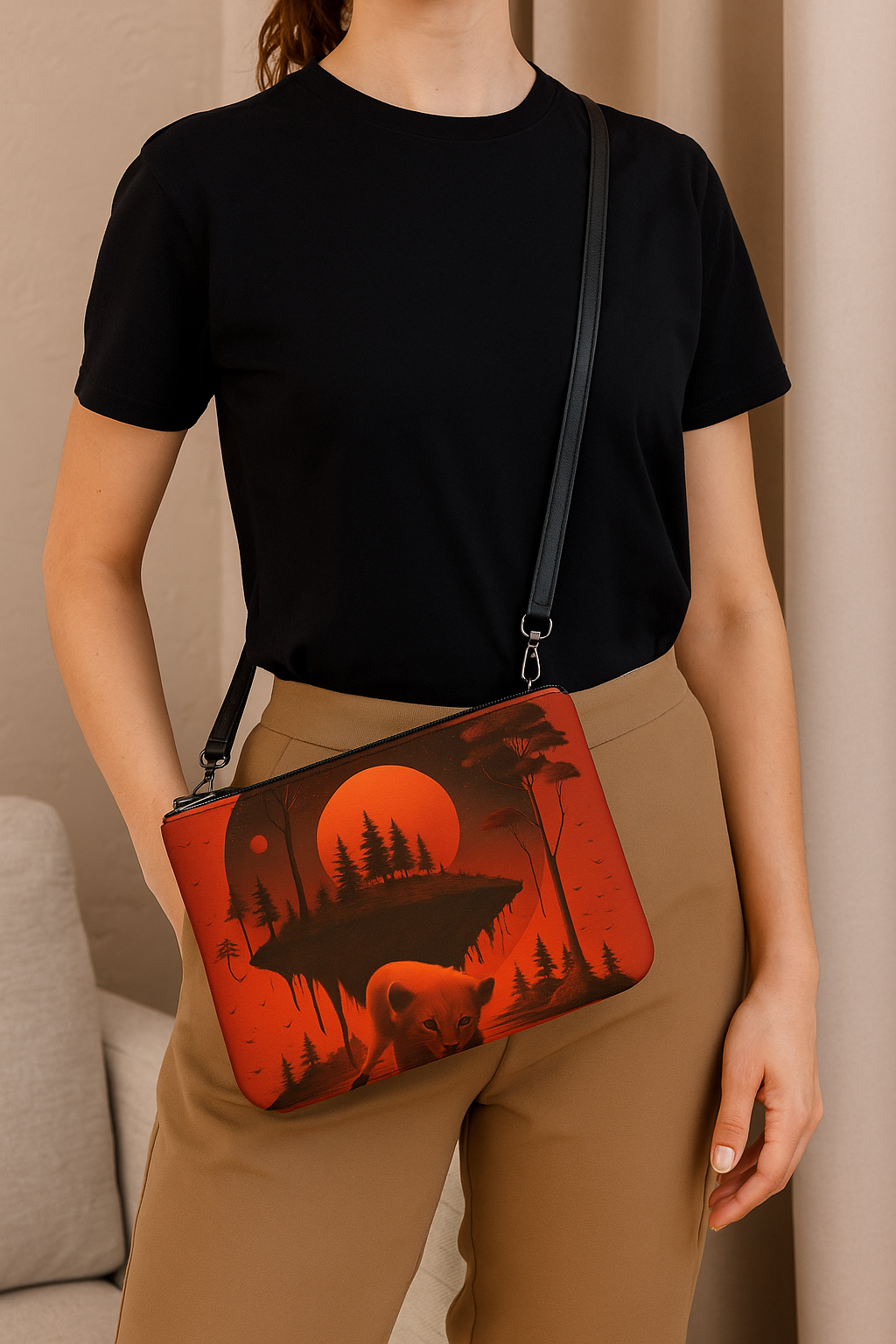 Step beyond the everyday with the Crimson Drift Crossbody — a wearable canvas of mystery and motion. Featuring a floating island of towering trees set against a deep red moon, this design evokes a quiet power, like a secret place suspended between realities. The dark silhouettes and vivid orange-scarlet hues create a sense of stillness wrapped in intensity — a bold visual for those who walk their own path.